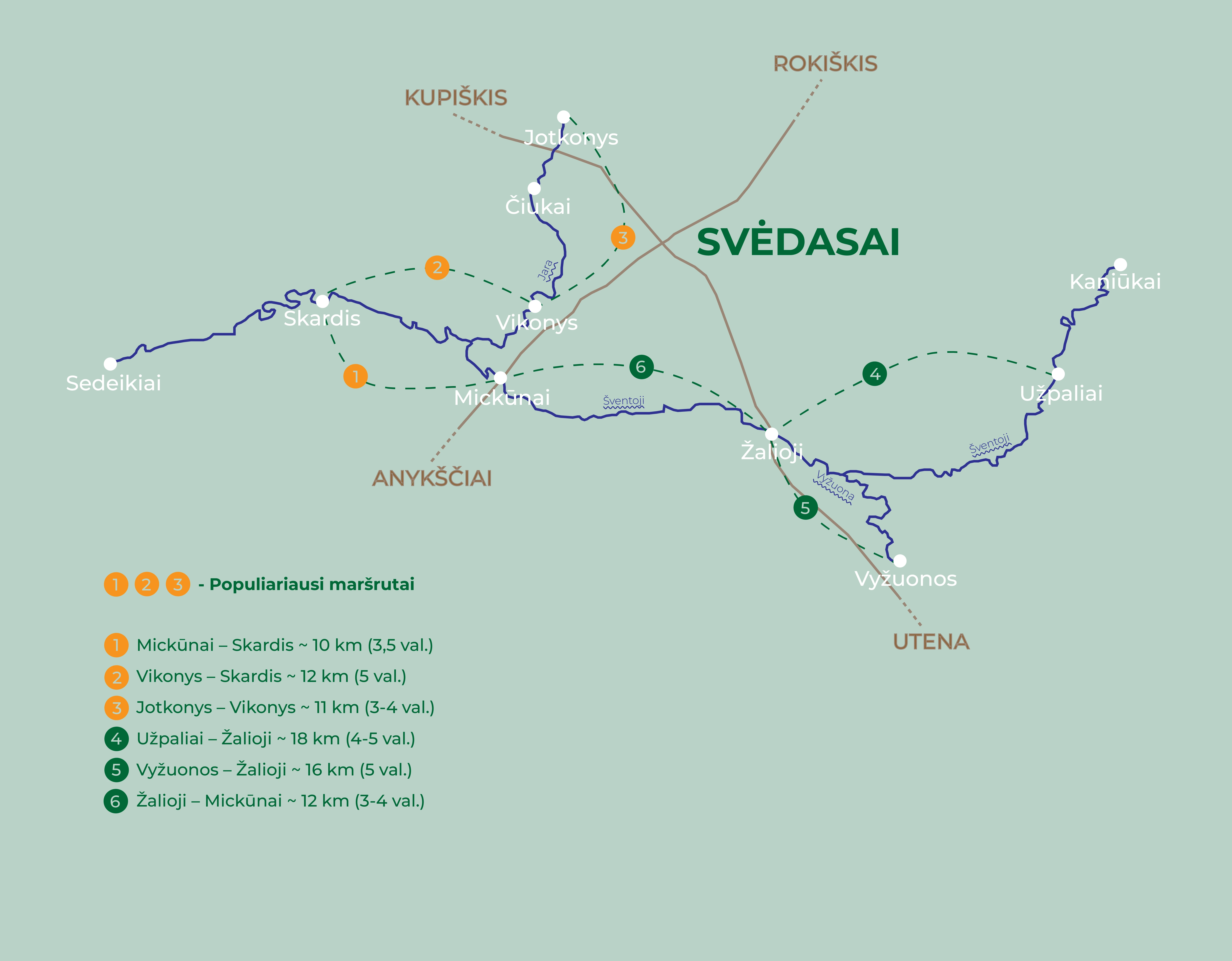 Detali maršrutų schema su atstumais ir trukmėmis. Populiariausi maršrutai pažymėti oranžine spalva.